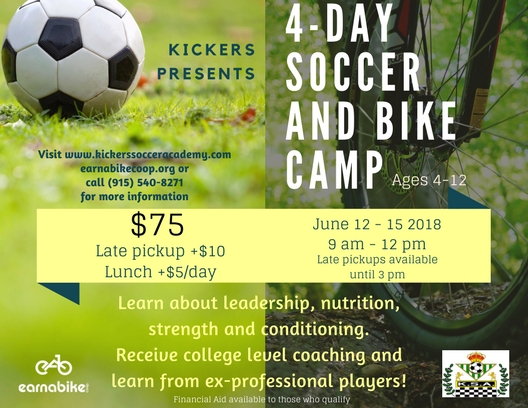 This year, Kickers Soccer Academy is teaming up with Earn A Bike Co-op to host a Soccer & Bicycle Camp. We will also be focusing on more than just soccer skills, we will be teaching about leadership, nutrition, strength, and conditioning. Lunch & late pickup is available for an added fee.